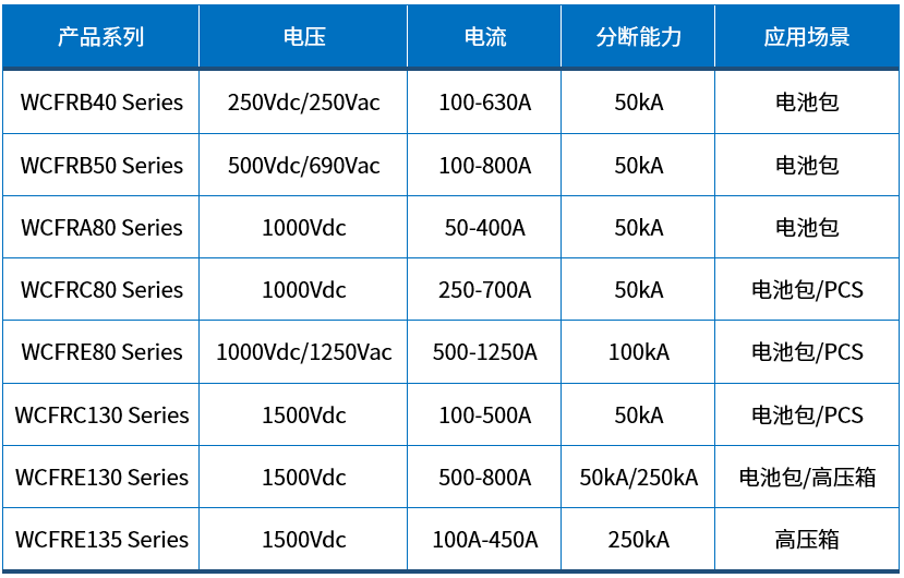 维安不仅提供多样化的熔断器产品,还能够根据客户的具体需求,提供定制化的应用匹配方案,保证上级与下级熔断器在各类复杂场景中的有效联动,比如250V电池包保护+1500V高压箱保护、500V电池包保护+1500V高压箱保护、1000V电池包保护+1500V高压箱保护、1500V电池包保护+1500V高压箱保护等方案。